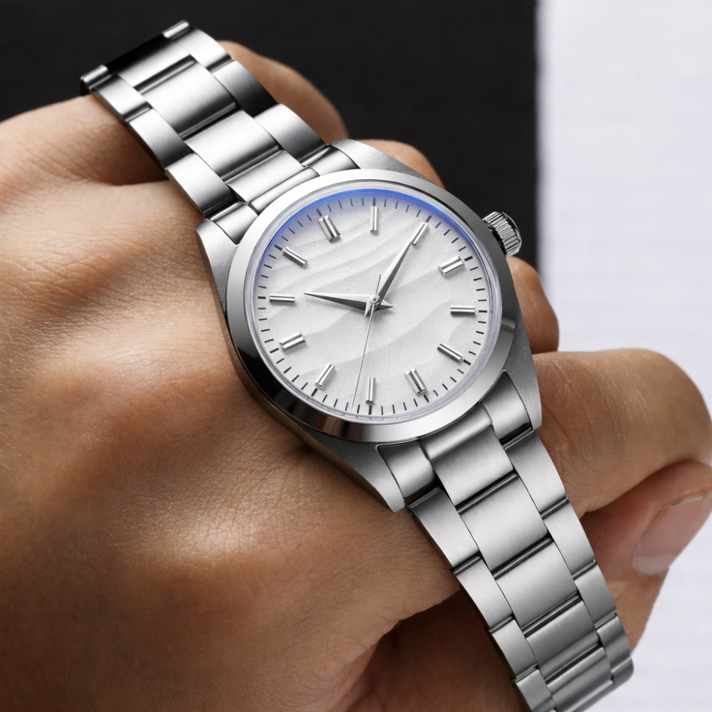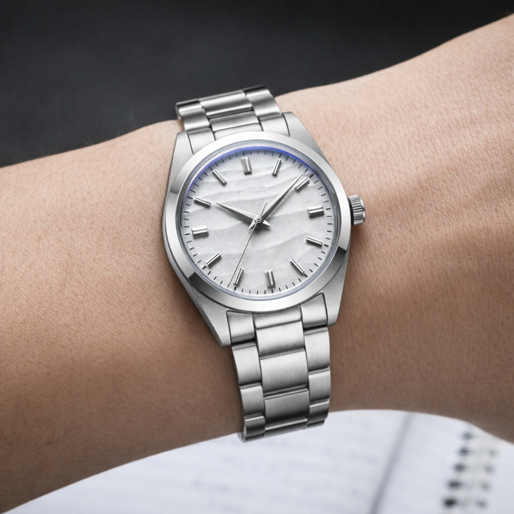 The round 36mm case sits with a balanced 46mm length and a 12mm thickness, keeping the profile controlled on the wrist. A screw-down crown with locking bar and a solid screw-in caseback support a secure structure. The stainless steel bracelet uses a bracelet clasp for a steady fit, and the domed mineral glass adds subtle depth with an anti-dazzle coating to reduce glare.