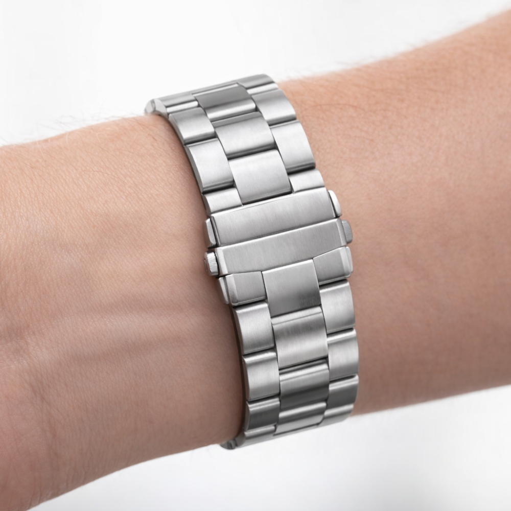 - Solid 316L stainless steel case and bracelet with brushed + polished finishing