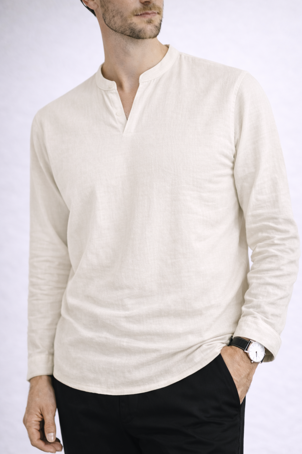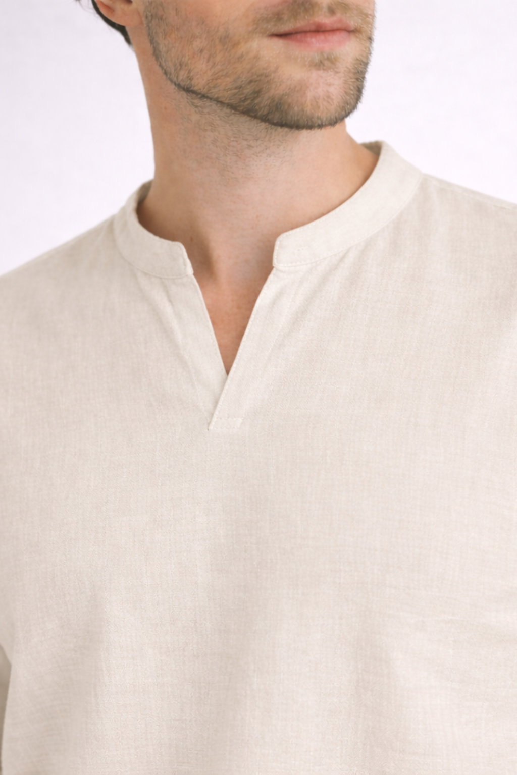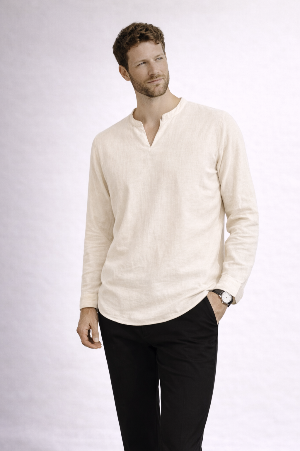 The Baruet Linen V-Shirt is designed as a casual essential, combining a breathable cotton and linen blend with a clean pullover structure. The V-neck collar and full-length regular sleeves give the piece a relaxed profile suited to everyday settings.
